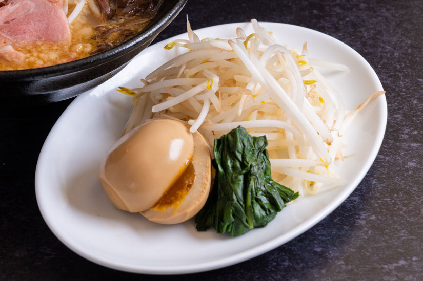 ラーメンを注文するとプラス300円で、3種類の人気トッピング「味玉・もやし・ほうれん草」のセットを提供