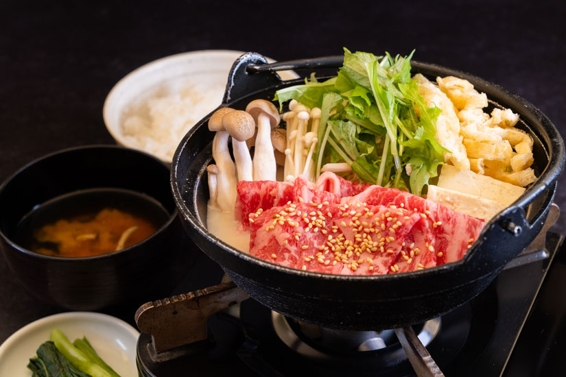 信州牛を贅沢に使った特製の豆乳鍋。野菜、豆腐、油揚げなどが入った、冬にピッタリのあたたかいお鍋