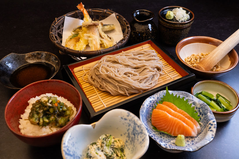 胡桃、蕎麦、天婦羅、刺身、小鉢、野沢菜御飯が付いた豪華なオリジナル御膳