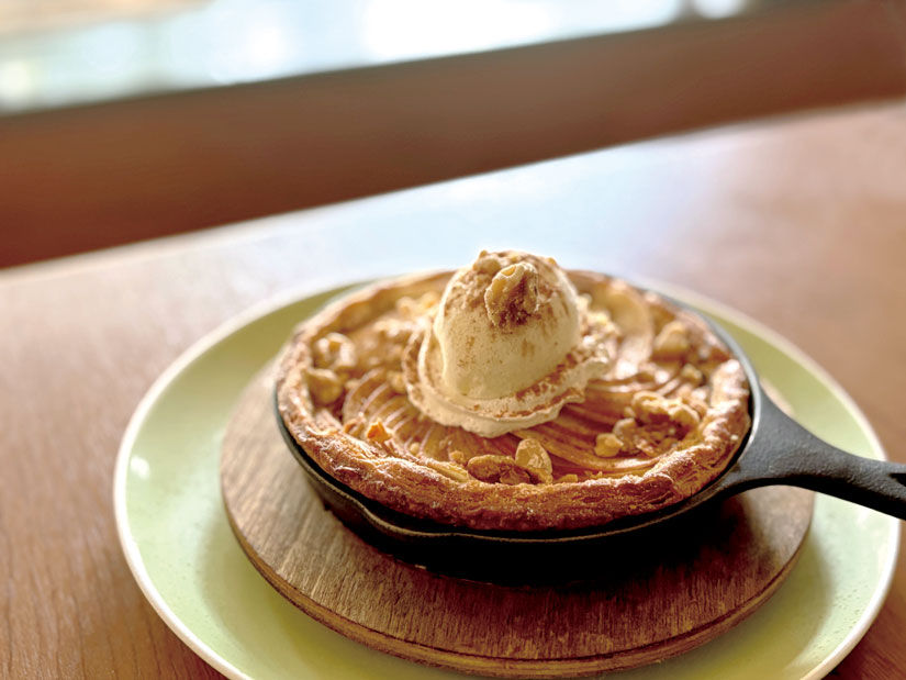 熱々スキレットで香ばしく焼き上げた特製りんごパイ。りんごも赤ワインもブルーベリーも長野県産、地産地消の贅沢な一皿。※サービス料13%別途