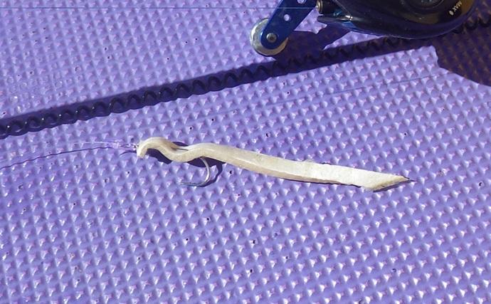 「しゃくってリール1/2巻き」で、モーニングタイムで立て続けに2匹釣り、このままこの「筆者の基本パターン」で続けていこうと思うも、アタリは出るもののフッキングせず、エサのみ取られてしまうパターンが続く。水深75mで手巻き。エサの確認だけでかなり体力を消耗してしまう。