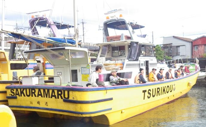 朝4時に受付開始(&席確保)の6時50分出船。基本料金には氷ブロック1つと仕掛け1組がサービスされ(追加購入は1つ500円)、エサのコノシロは乗船料金に含まれます。4時半頃に到着し、受付を済ませると、船は定刻通りに出船。1時間程走って8時に猿島沖に到着。