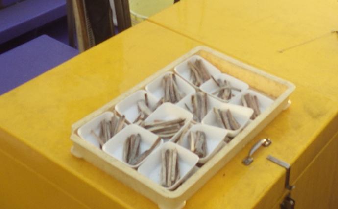 そこで、横で順調に釣っている方(竿頭でした)をじっと観察。すると、「小さくシャクってリール1/3~1/4巻き」でアタリを出していることに気づく。そこで必殺「真似」を試みると、ここからエサのみ取られることが激減。前半戦でとりあえず目標としていたツ抜けの二歩手前、8匹の確保に成功!