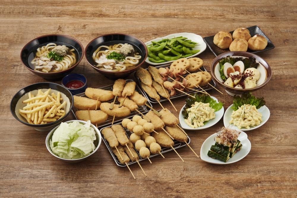人気の串カツ8種に、名物の「牛すじ土手」、自分で焼いて楽しめる「たこ焼き」など、大阪の味と体験が詰まっています。