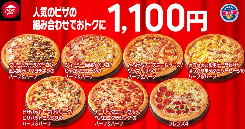 対象ピザは、「クリームチーズベーコン/直火焼 テリマヨチキンのハーフ&ハーフ」「ジューシー厚切イベリコ/じゃがマヨコーンのハーフ&ハーフ」「とろけるチーズミートソース/ツナマイルドのハーフ&ハーフ」「とろっとカルボナーラピザ/ほっくりポテマヨソーセージのハーフ&ハーフ」「ピザハット・マルゲリータ/ピザハットミックスのハーフ&ハーフ」「ガーリックミートグルメ/ペパロニクラシックのハーフ&ハーフ」「フレンズ4」の7種類。