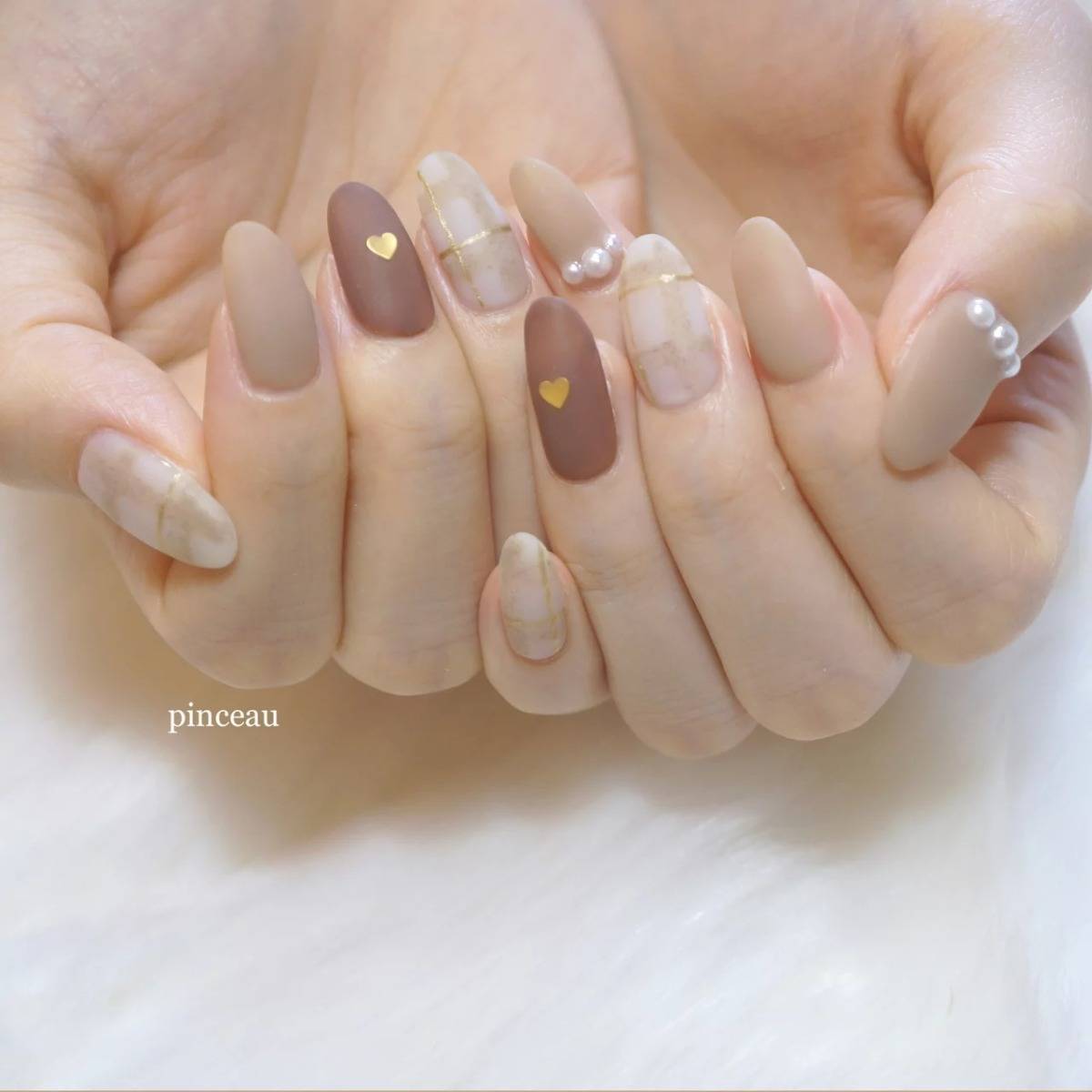 落ち着いたベージュやブラウンを組み合わせて、遊び心のある大人ネイルに仕上げてみて♪