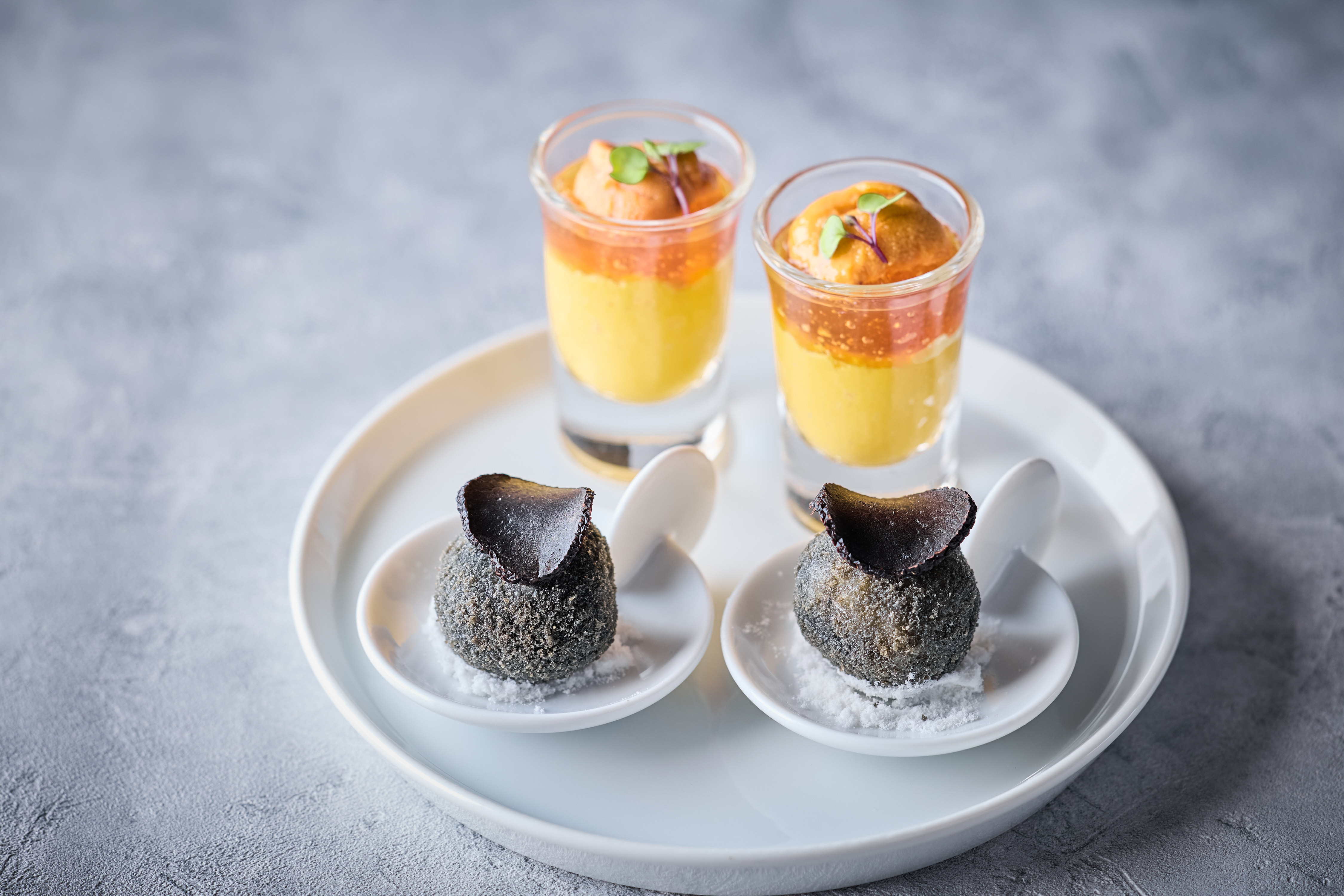 1段目には、甘みのある碧南人参のムースとコンソメジュレに贅沢な雲丹(うに)をのせたヴェリーヌ。