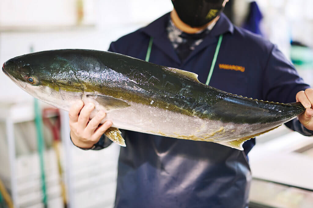 天然ブリも丸ごと販売。時季によっては30キロものヒラマサが並ぶことも。