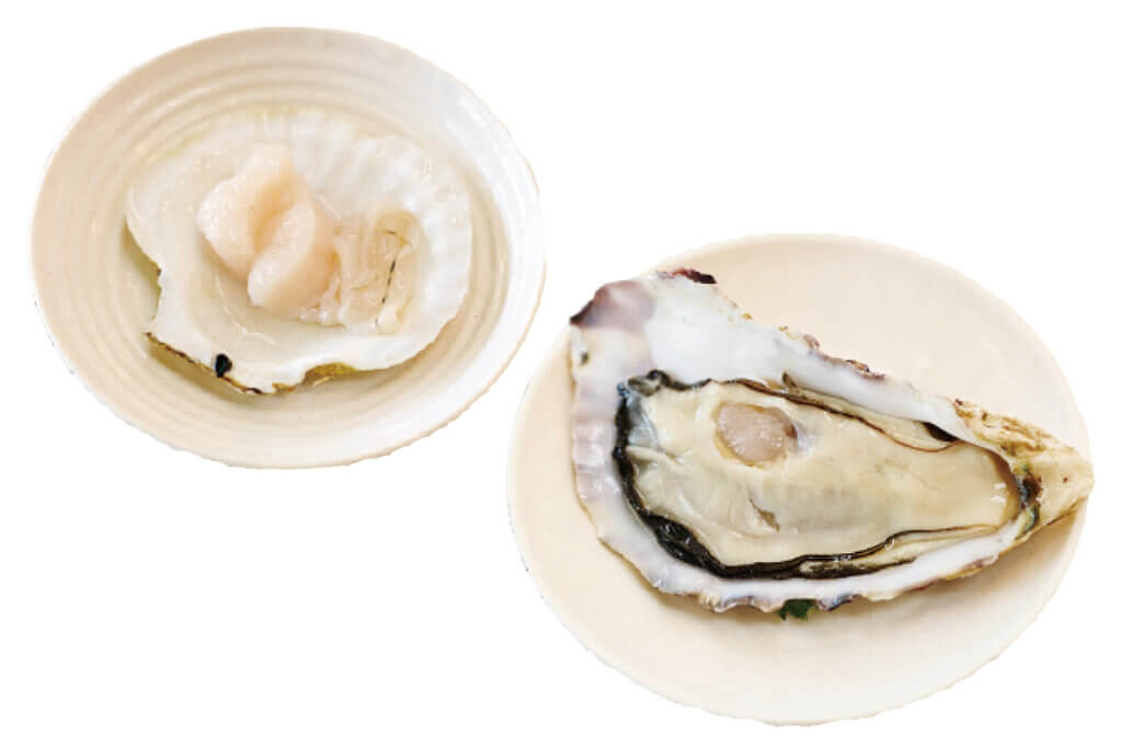 その場で味わう肉厚で新鮮なカキやホタテは格別。しょうゆやポン酢など調味料もそろえているので、好みで楽しんで。