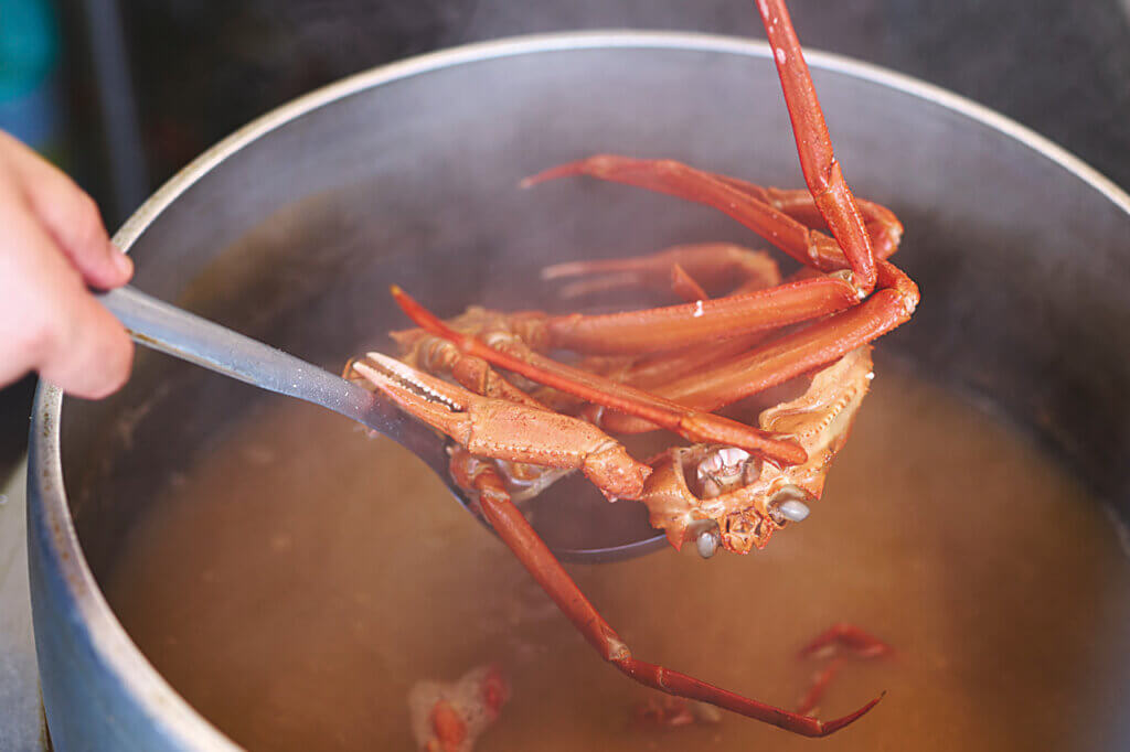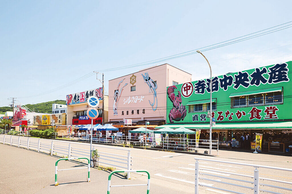 食べ歩きはもちろん、屋根付きの休憩所で味わうのも◎。大型のズワイガニや、カニのうま味が凝縮されたかに汁も見逃せない。