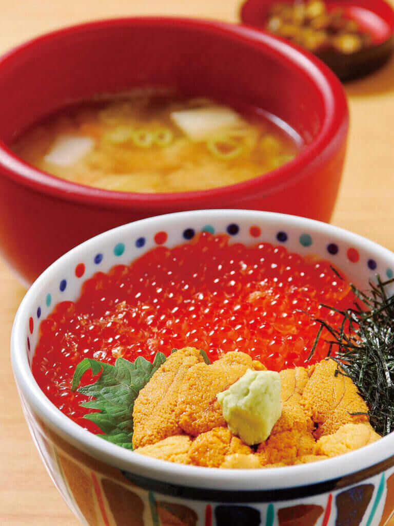 寺泊中央水産が手がける食堂。濃厚なウニとイクラを半分ずつ盛り付けた二色丼(3,100円)や、カニ1杯が付くまるなか定食(2,800円)が定番。カニやエビの頭が入った具だくさんの番屋汁もセットになって、食べ応え十分。