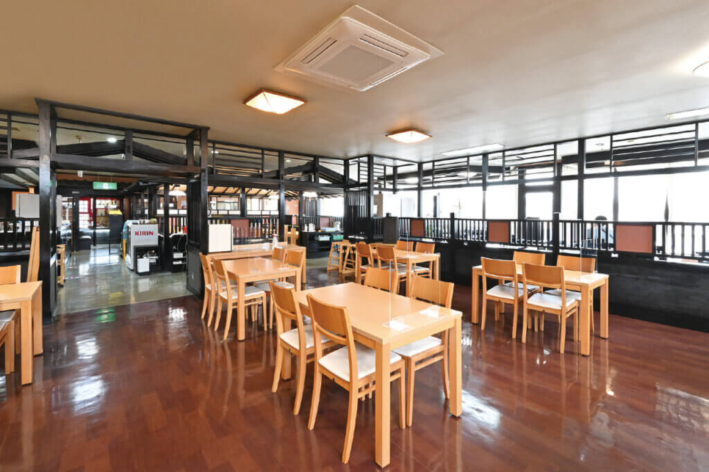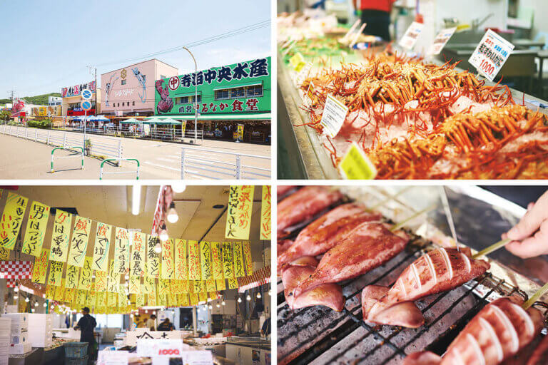 海鮮丼や寿司のほか、浜焼きや揚げ物といった多彩な海の幸は店内のイートインスペースでいただくことも。魚のアラやエビ、カニなどを煮込んだ番屋汁は、濃厚なだしのうま味が体に染みわたる不動の人気メニュー。