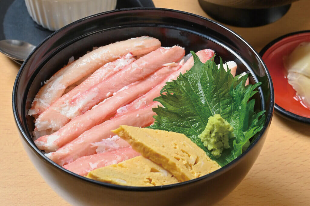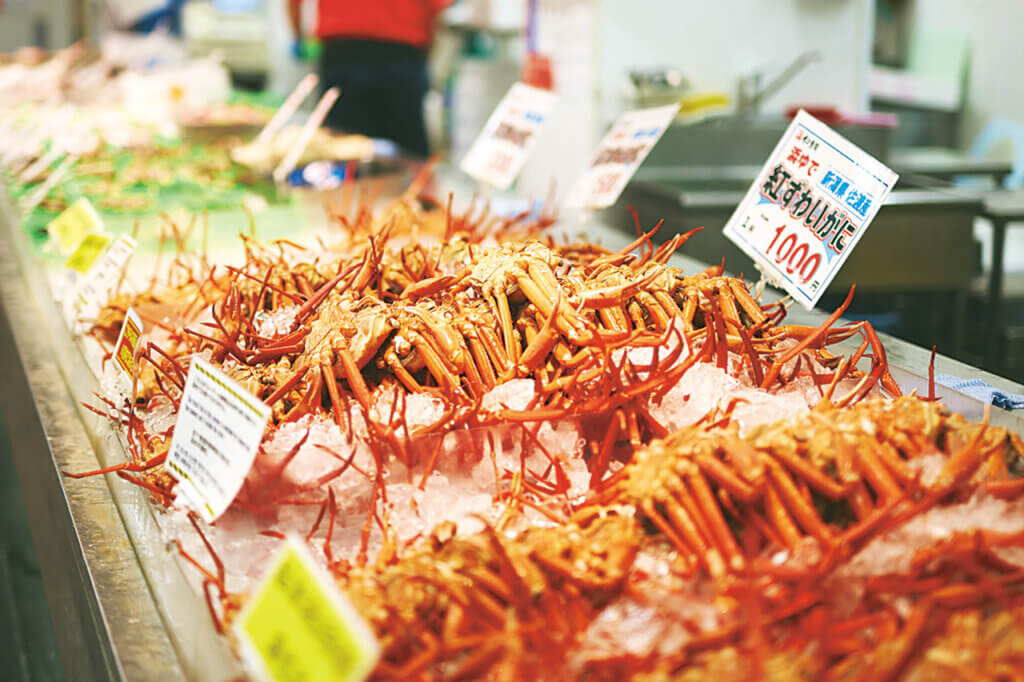 観光客で連日にぎわう食事処。名物は、厳選して仕入れた紅ズワイガニを酢飯の上に大胆に敷き詰めた、市場ならではの豪快なカニめし丼(2,200円)。身が引き締まったカニは、噛むたびに自然な甘みが口いっぱいに広がる。