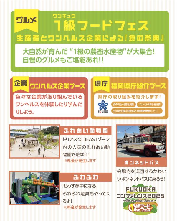 『FUKUOKAコンファレンス2025』は、9月27日(土)・28日(日)の2日間、「トリアス久山」(WESTゾーン)で開催されます。イベントのテーマは「ワンヘルス」。みずみずしい県産食材や楽しい体験を通して、人・動物・環境のつながりを感じながら「ワンヘルス」を楽しく学べるイベントです。