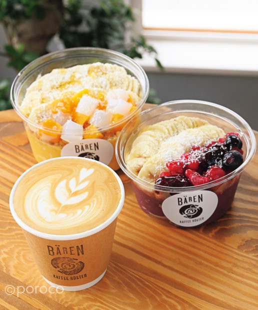 「カフェラテ」580円、プラス中煎りの「エチオピア ブク アベル」210円。アサイーボウルは「KAFFEE BÄRENオリジナル」S1,100円、「トロピカルカスタマイズ」M1,850円。