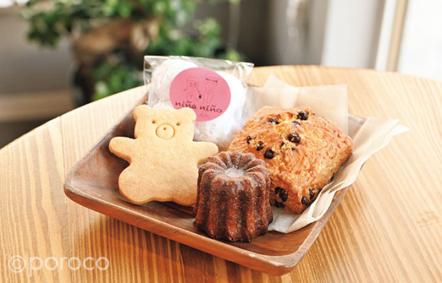 焼き菓子もどうぞ! 「チョコチップスコーン」360円、「カヌレ」420円、「くまクッキー」250円、「クッキー」280円。