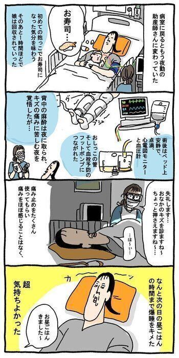 たまに助産師さんが観察や点滴の交換に来てくれるのを何となく感じながら、寝返りすることもなくひたすら寝てました。またあのときの熟睡感を味わいたい…