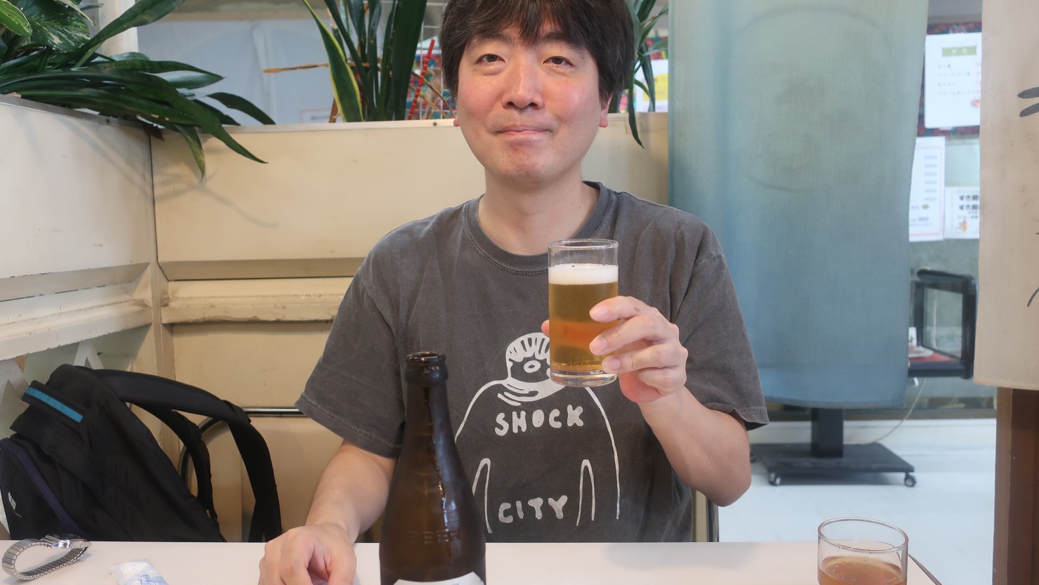 今回、私は450円のラーメンを。編集担当・Mさんは天津飯を注文しました。瓶ビールの中瓶をもらい、駅からダイエーまで歩いてきただけですが、早速乾杯します。ラーメンは、甘みを感じるスープとシャキシャキしたもやしの食感が印象的でした。Mさんの前に運ばれてきた天津飯はご飯が茶碗2杯分は使われていそうなサイズ感。さすが「若水」です。長年にわたってこの場所で地元の人たちの空腹を満たしてきた店なのだなと、歴史を感じる店内を眺めながらありがたくいただきました。