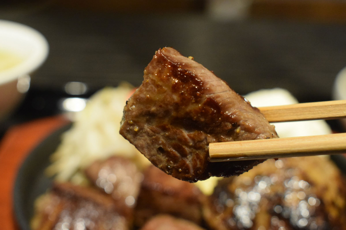 まずはサイコロステーキを一口。表面はカリッと香ばしく焼き上げられ、中はふっくらやわらかい絶妙な火入れ。噛むたびにお肉の旨味が感じられて、ご飯が進みます。