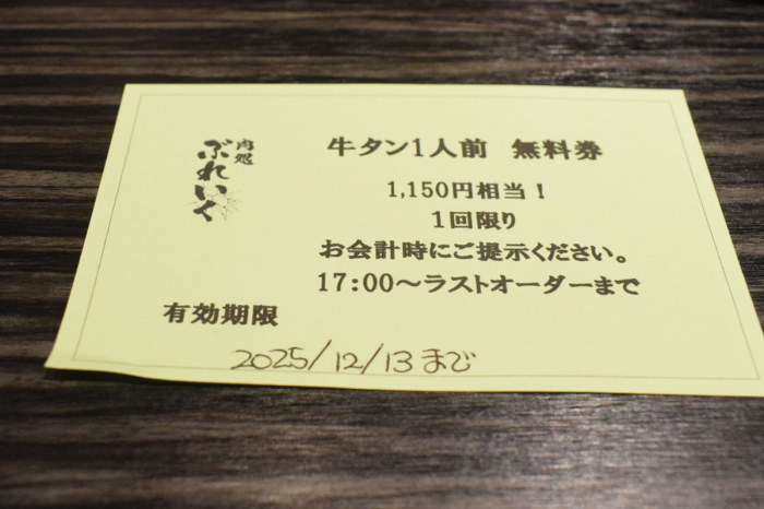 そしてさらに嬉しいサービスが。ランチの利用で、ディナータイムに利用できる「牛タン1人前 無料券」がもらえます。思わず「次は夜に食べに来よう」と思ってしまう太っ腹さ。