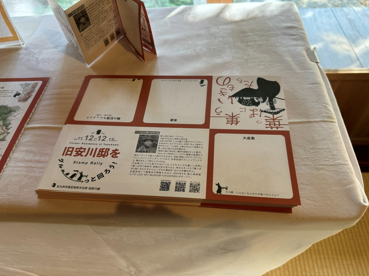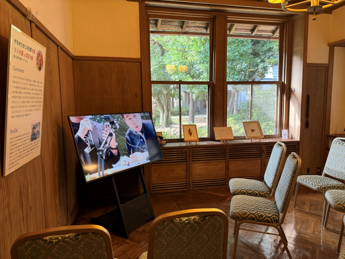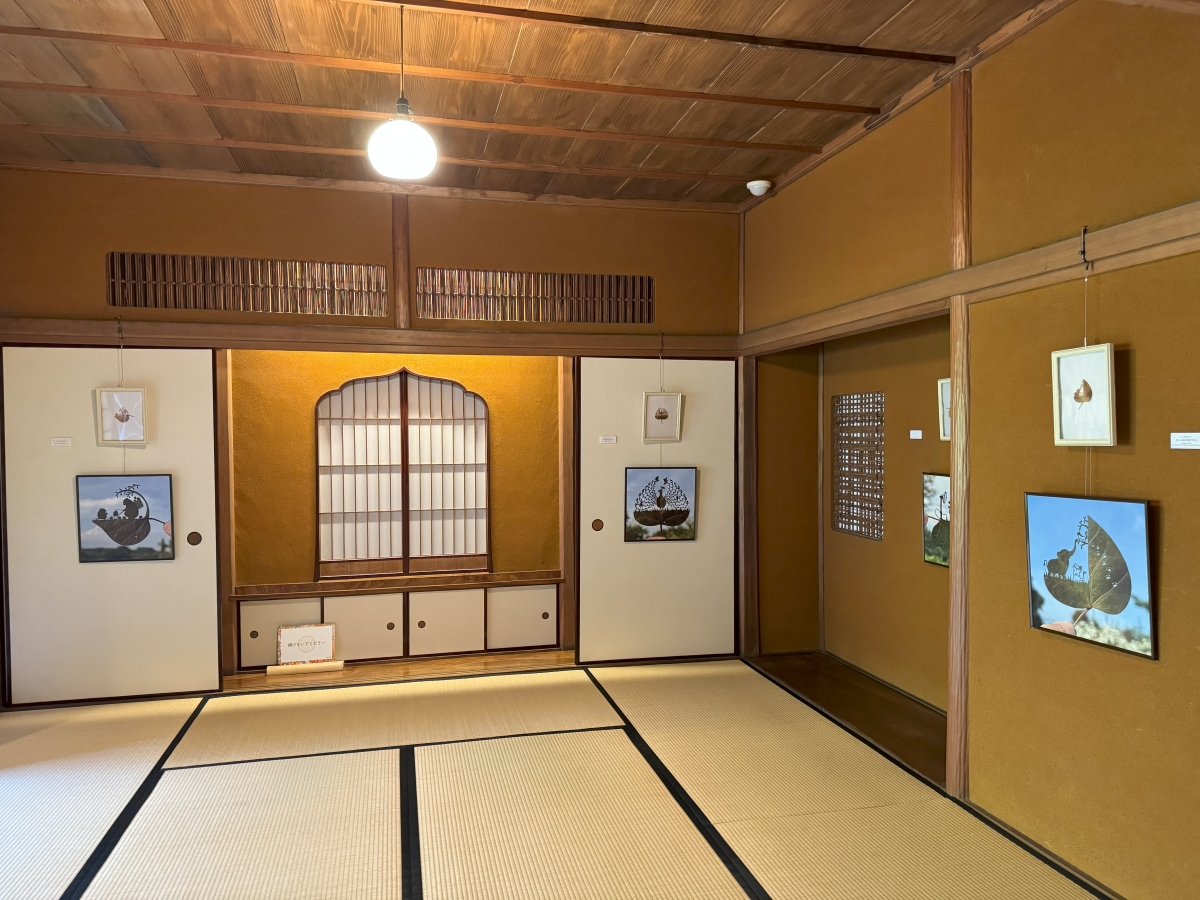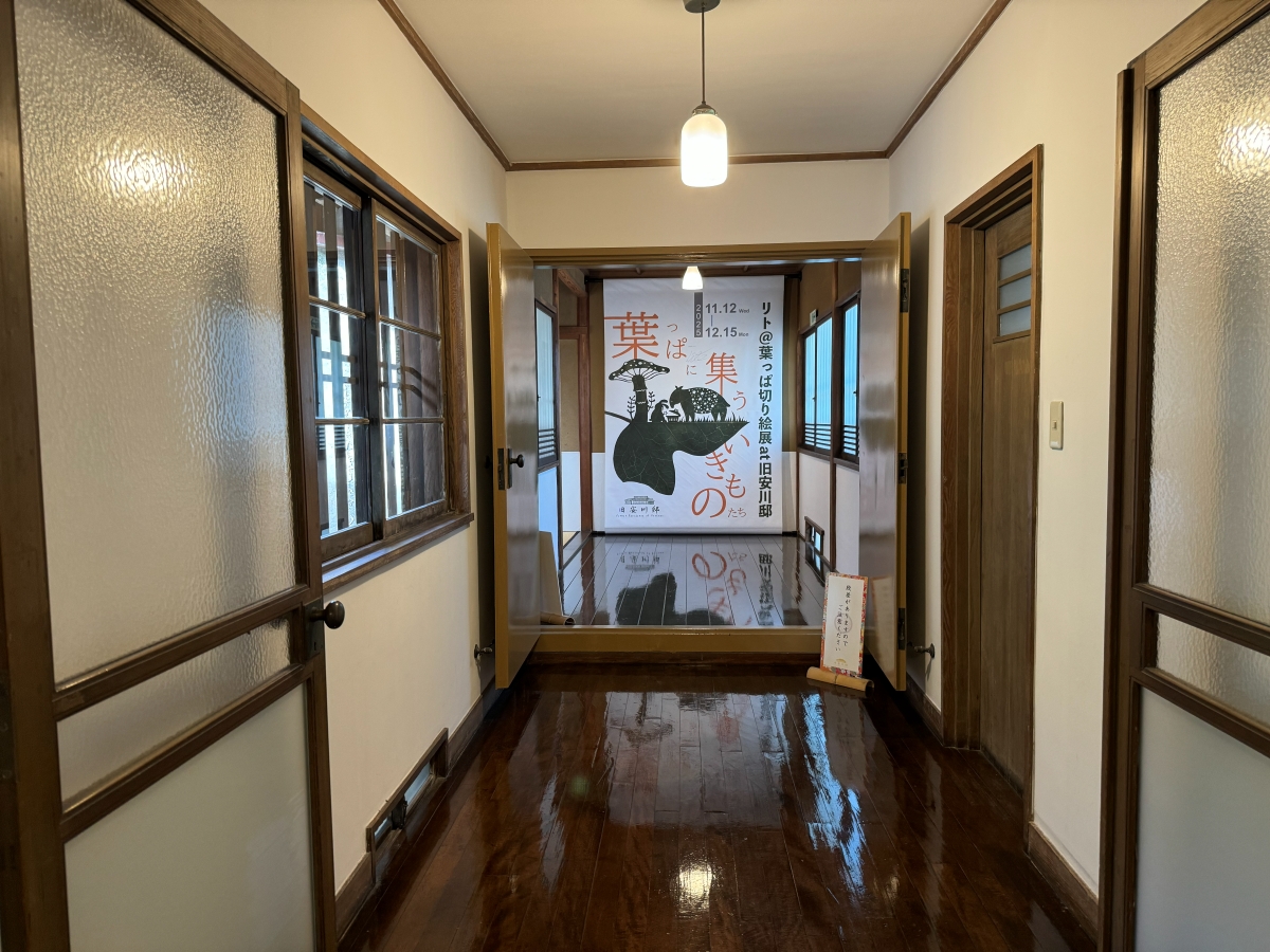 旧安川邸という歴史的建造物と、リトさんの葉っぱ切り絵が重なり合う興味深い展示会でした。