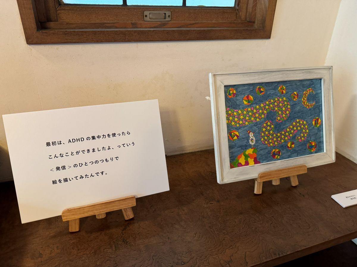 まず左手の小部屋には、作家・リトさんが「葉っぱ切り絵」を始める前の作品が展示されており、制作の試行錯誤や葛藤が伝わってきます。