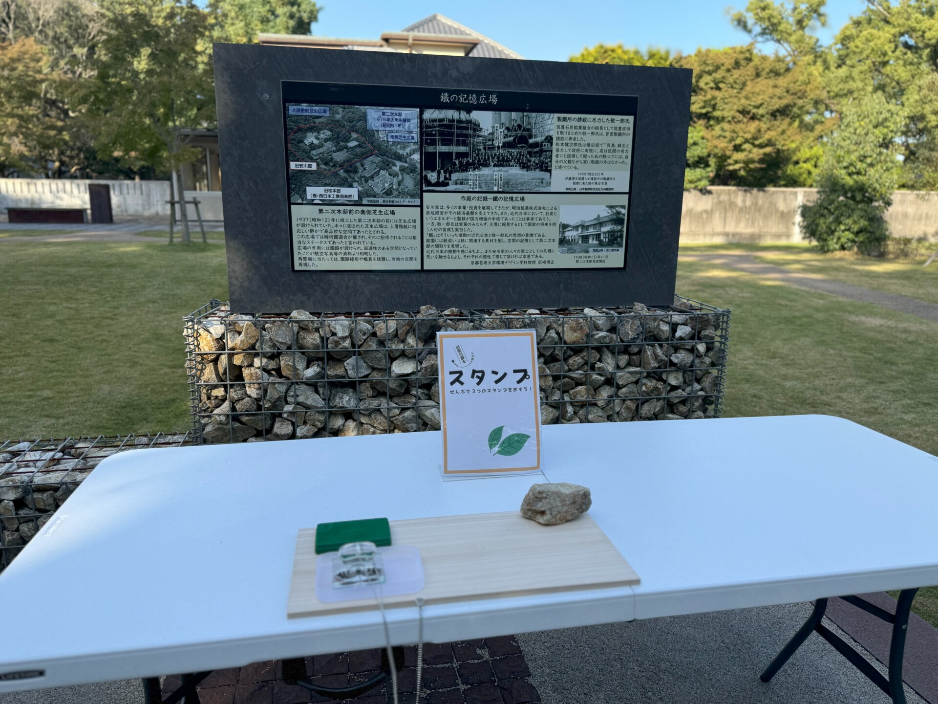スタンプを押したら、最後は鐵の記憶モニュメントへ。安川家の歴史と日本の近代化を象徴するモニュメントの前で、ラストのスタンプを押せばコンプリートです。
