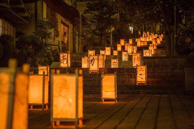 近鉄生駒駅周辺から二の鳥居を越えて宝山寺参道まで約1,000基のあんどんが並び、夜の闇をあたたかい光が包みます。当日14時から洗心閣前庭にて中高生によるお茶席が開催されるほか、18時ごろからは大鳥居下にて、クロマティックハーモニカのライブ演奏が行われます。