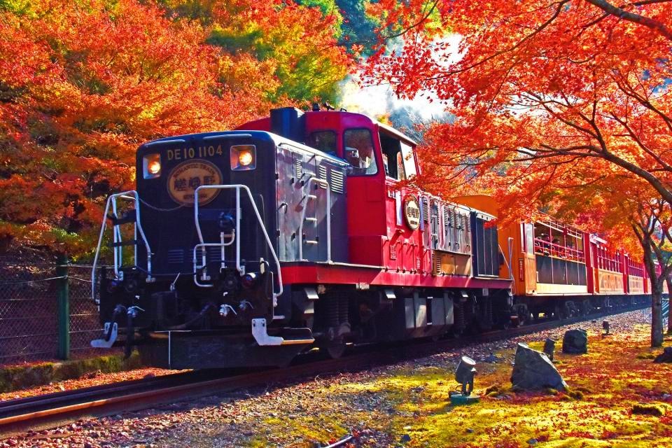 保津川沿いに、片道7.3㎞を走るトロッコ列車。ゆっくりゴトゴト進むかわいい列車に揺られながら、沿線の自然や渓谷の美しさを堪能できます。当日券もありますが売り切れることも多く、行楽シーズンには特に予約をおすすめします。