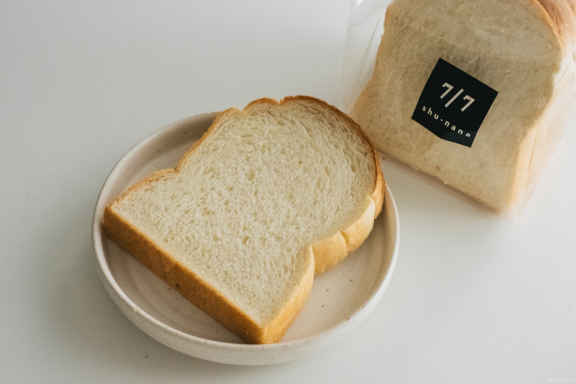 「7/7」の食パンは厚さ約2.5cmの5枚入り。高さは約14cmで一般的な食パンの大きさと同じです。袋から取り出すときの食パン全体のやわらかさにびっくりしますよ。安い食パンによくあるパサパサ感はなく、耳までしっとりやわらかです。