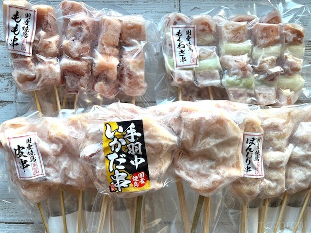 肉厚で濃厚な味わいの「もも串」、もも肉の脂とねぎのさっぱり感が魅力の「ももねぎ串」、ジューシーな脂の旨みの「ぼんじり串」、プリっとした食感の「皮串」や、凝縮した旨みが特徴の「手羽中いかだ串」の全5種類。いろんな部位が楽しめる「盛り合わせ」もあって便利です。