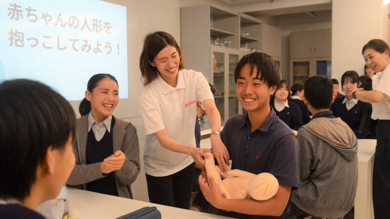 同授業は、同社が「赤ちゃんにやさしい未来」を実現するため、日本全国の中学生を対象として提供している「赤ちゃんを知る授業」の一環として実施。核家族化や少子高齢化で育児に触れる機会が少ない子どもが増えている切実な現実を受け、未来を創る世代に育児の“早期教育”を提供。育児への関心と理解を深めることで、社会全体で育児を支える環境作りを目指している。