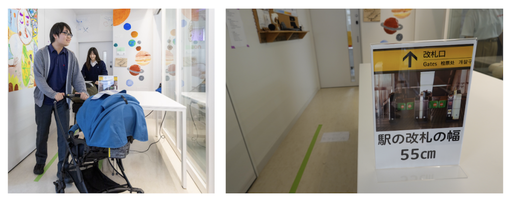 ベビーカー体験では、実際のベビーカーを使い、生徒たちは教室内外を移動。駅の改札の幅を再現したゾーンでは思いのほか狭く、中には戸惑いの表情を浮かべる生徒も。