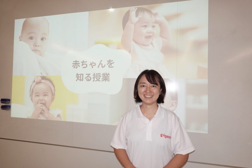 ピジョン株式会社の半澤ふみ江氏は、この授業を実施する意義について、「弊社は育児用品メーカーとして様々な商品やサービスの提供をしているが、その事業活動の中で周囲から理解をなかなか得られないことに悩むお父さん、お母さんがいらっしゃることに気づいた。その一方、少子化の影響で、身近に赤ちゃんがいない環境で育つ子たちが増えている。そこで弊社として何ができるか考えた時に、「この世界をもっと赤ちゃんにやさしい場所に」という弊社の存在意義のもと、中学生に教材を提供することで赤ちゃんの特徴や赤ちゃんにやさしい行動について知ってもらうことで、赤ちゃんにやさしい社会作りにつなげていきたい」と説明。