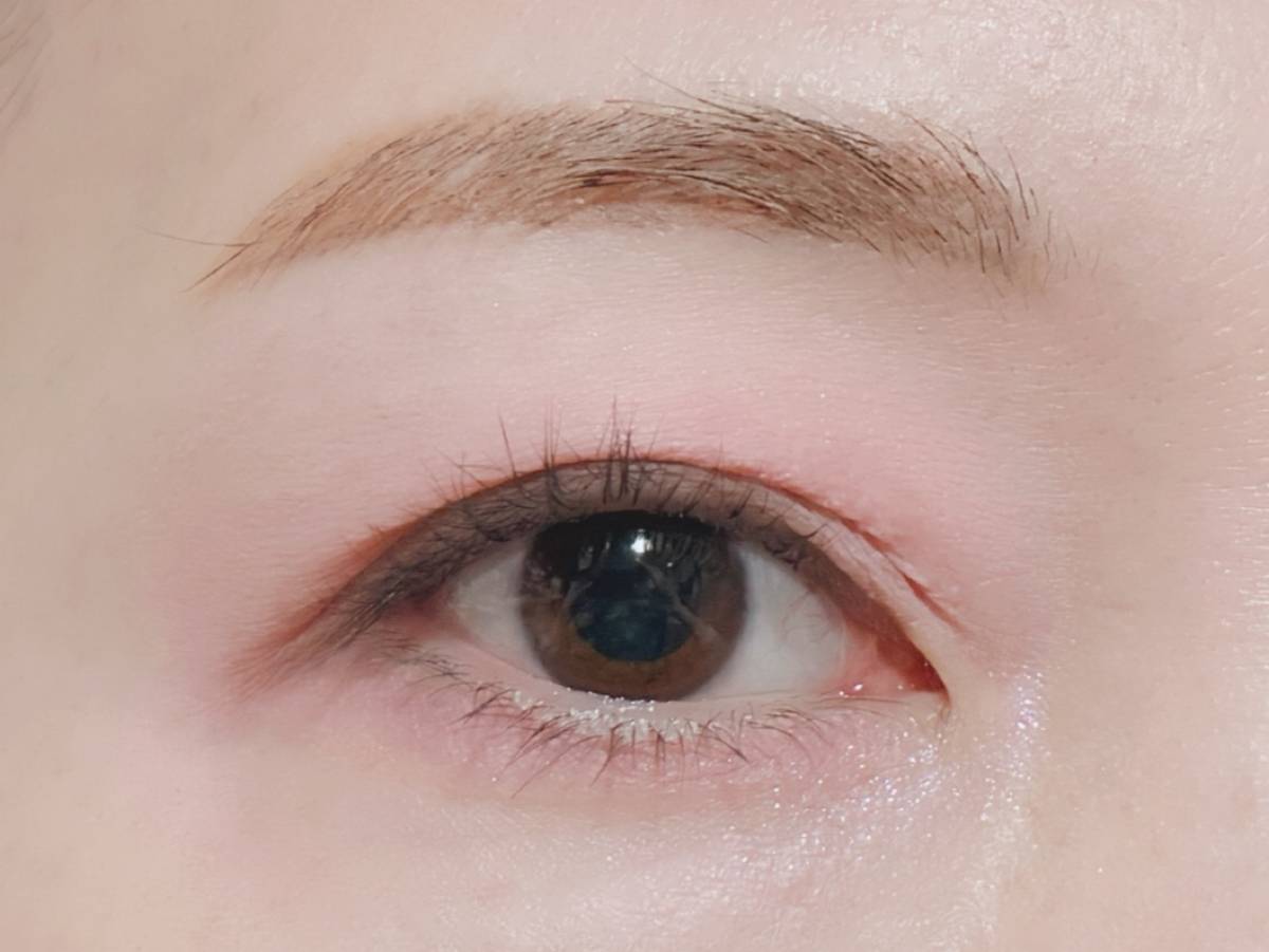 3. D:ブラウンを上まぶたのキワ(目尻は約1cm外まで)に細く塗布
