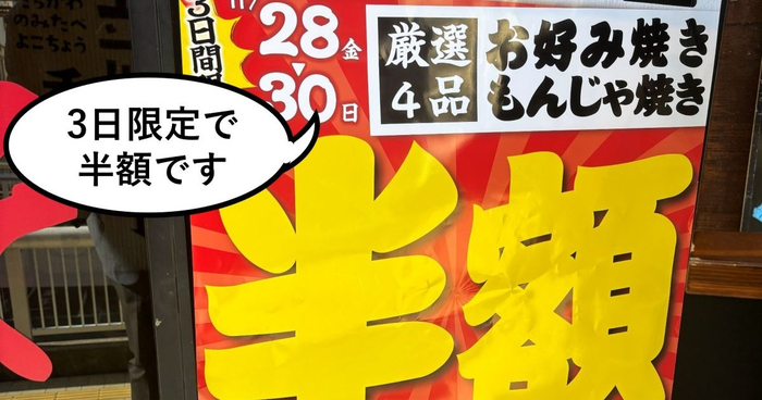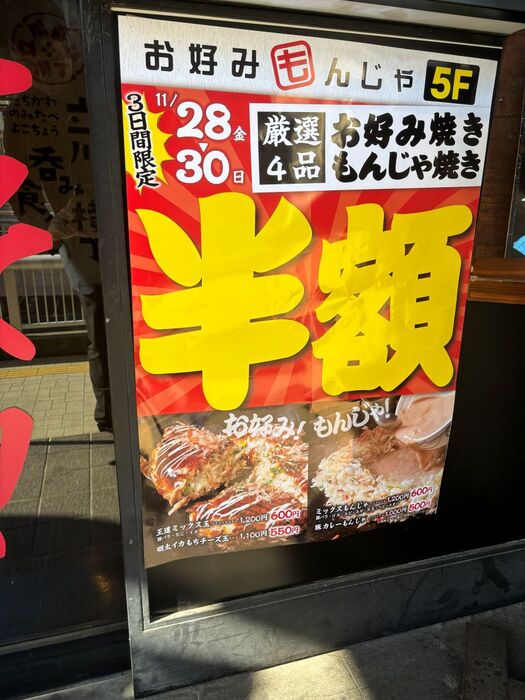『お好みもんじゃ 立川店』の半額セールは11/30(日)まで。