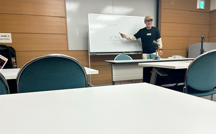 風や水深といった条件ごとの対応方法、地域ごとの特性(今回は大分に特化した内容)、アジの捕食事情など、さまざまな項目について講義がありました。YouTubeやInstagramではなかなか知り得ない内容だけに、メモを取る方が多い印象でした。