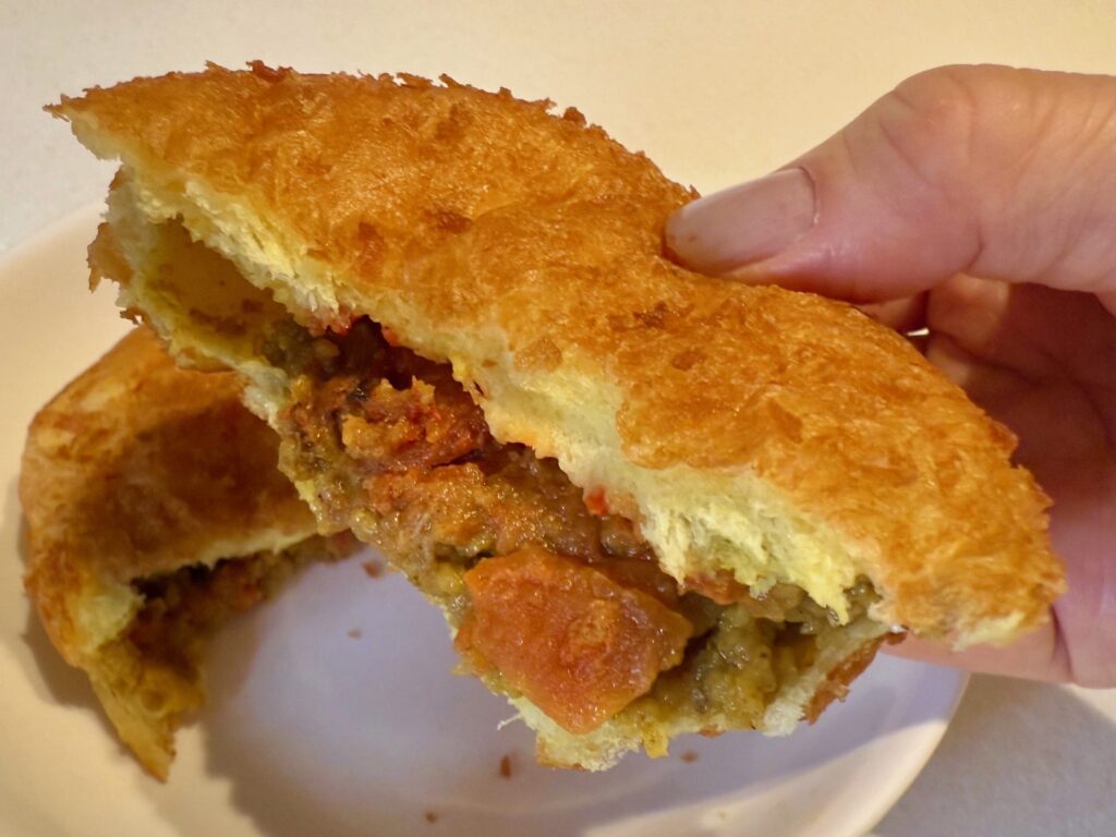 外はカリッとパン生地はもっちり、中には本格的なスパイスが複雑に絡み合いつつ懐かしさも感じるコク深いカレーが入っています。