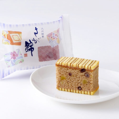 「『さが錦』は、数ある佐賀銘菓の中でも、真っ先に思い浮かぶTHE定番! 軟らかい生地に、山芋を練り込んで、ふんわり焼き上げた『浮島』を、バウムクーヘンで挟んだ和洋折衷のお菓子です! ふんわり生地の浮島と、しっかりした生地のバウムクーヘンが絶妙!