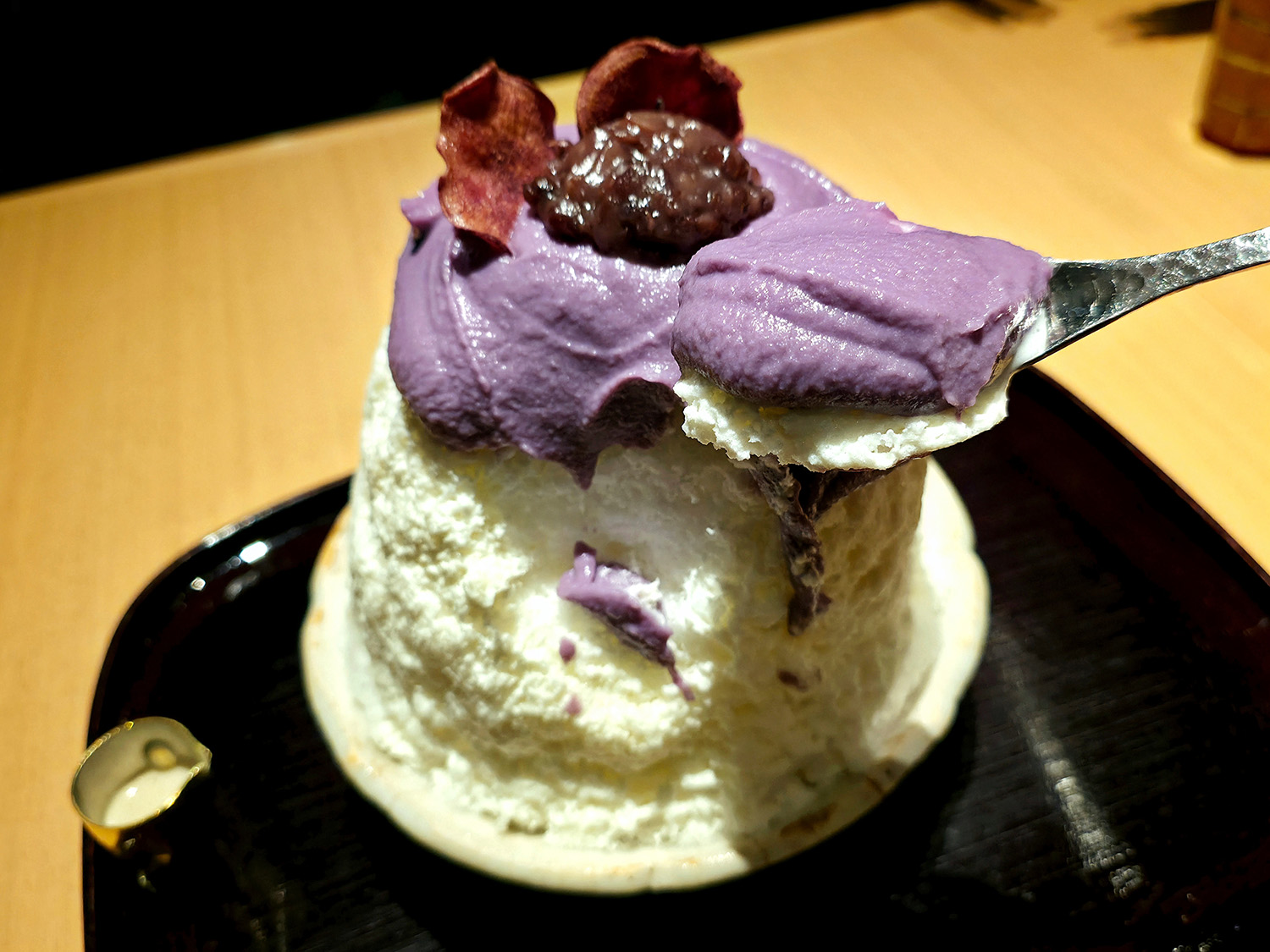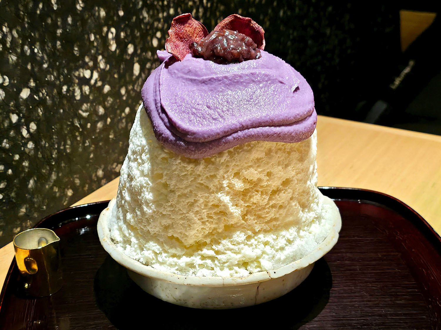 この“紫芋クリーム”をひと口味わった時に紫芋のホクホク感を覚えて、かき氷なのに、と驚き。さすがの味わいに、テンションMAXひゃっほー!