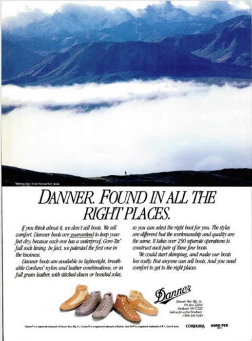 この2枚も「ダナー」の広告であり、写真や文言から「ゴアテックス」や「ビブラムソール」といった機能素材やアウトドアシーンとの強い結びつきを読み取ることができる。