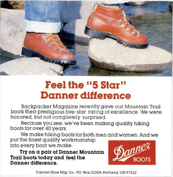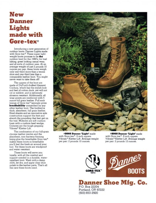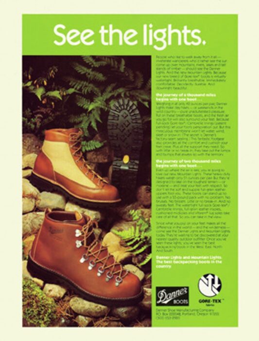 [ダナーライト]の誕生当時の広告。冒頭には「Introducing a new generation of outdoor boots(新世代のアウトドアブーツのご紹介)」と記されており、当時の革新的な発明であったことがうかがえる。
