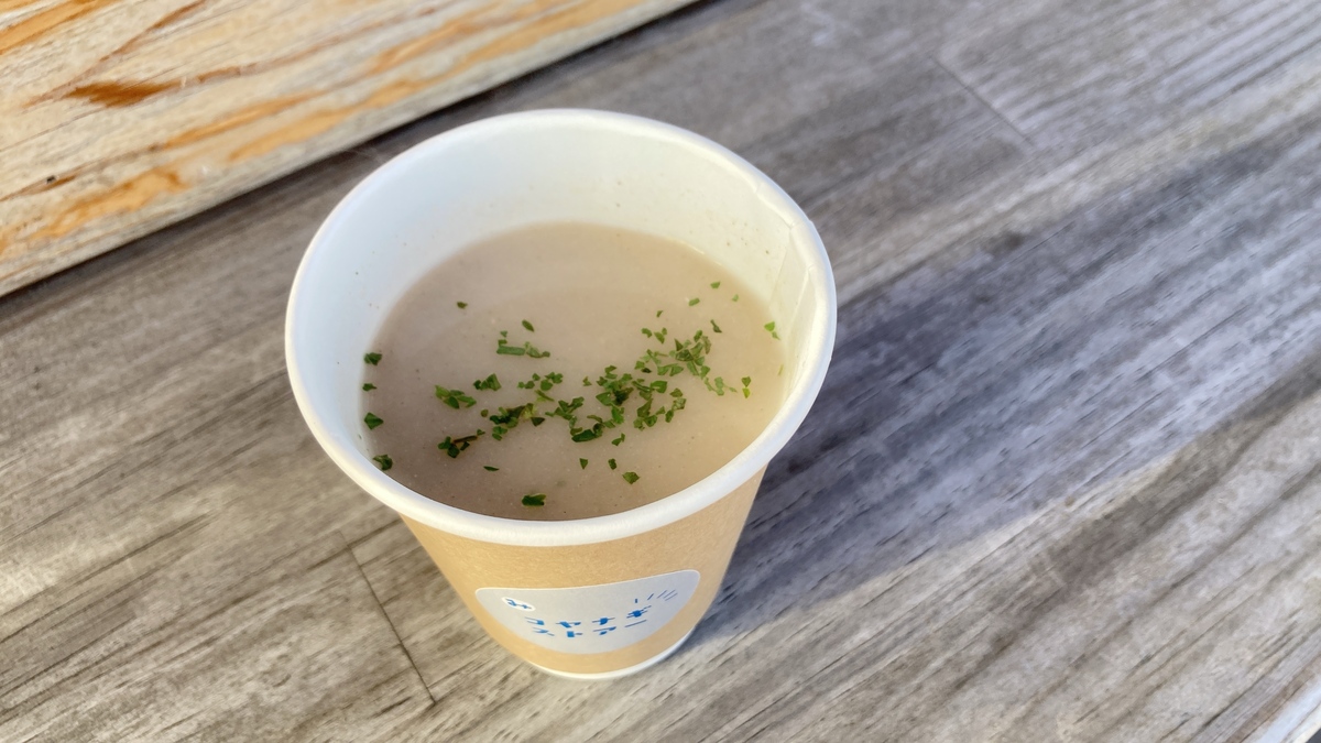 スープにはちゃんとクルトンがトッピングされており、大きな具はないためスプーンがなくても片手で飲みやすいのが嬉しいポイントです。