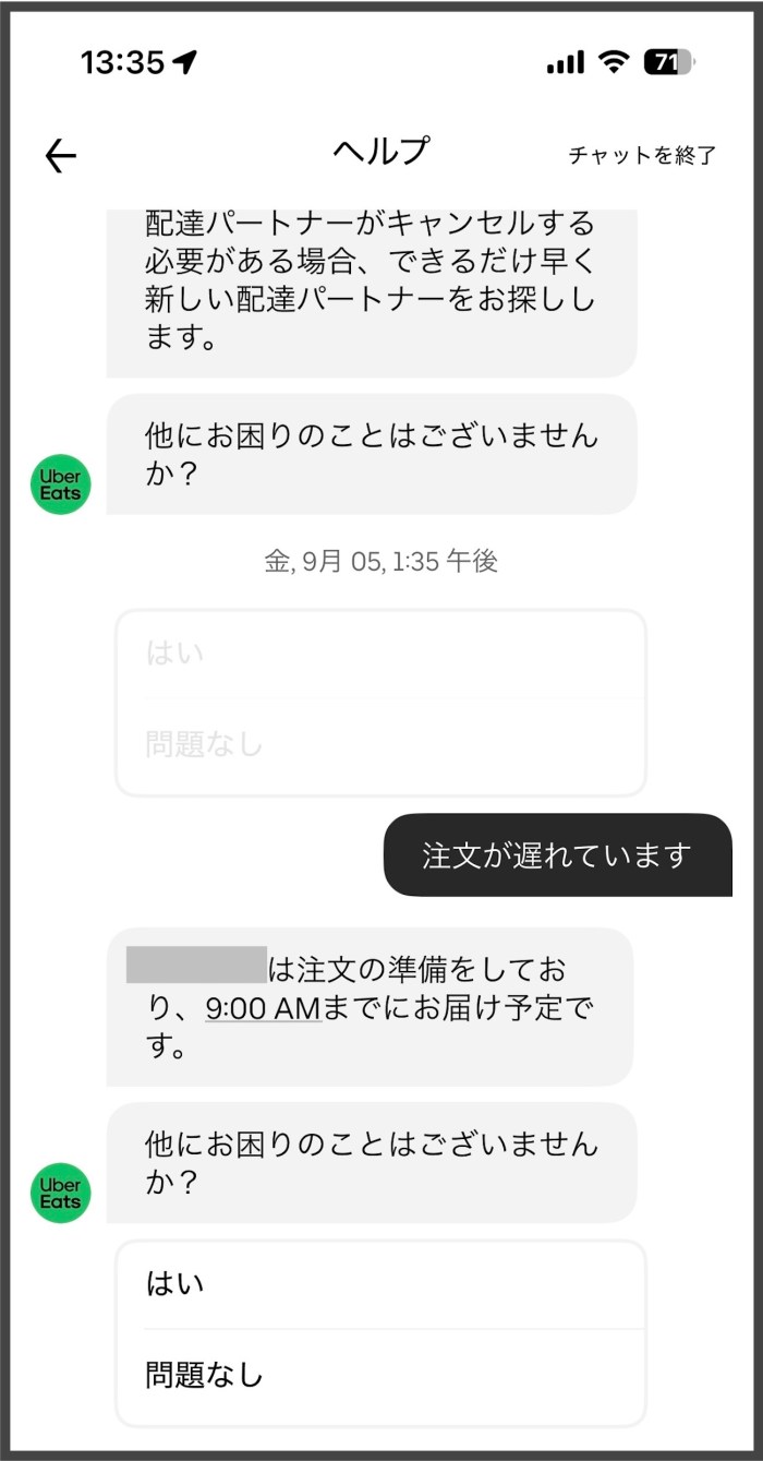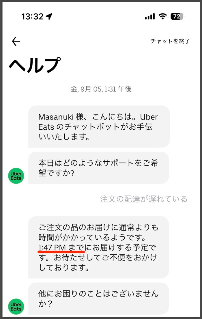 さすがにもう待てん。ってことで、アプリのチャット機能に助けを求めることにした。「注文の配達が遅れている」と選ぶと、すぐにチャットボットから返信が……