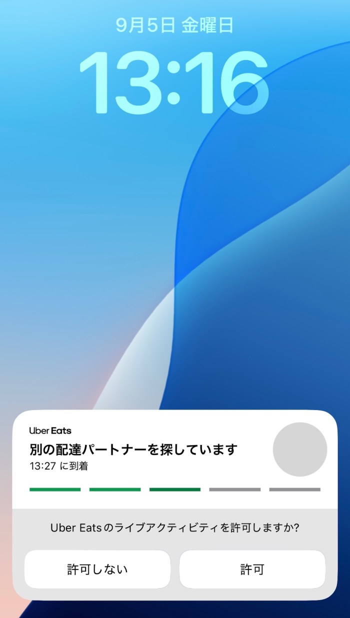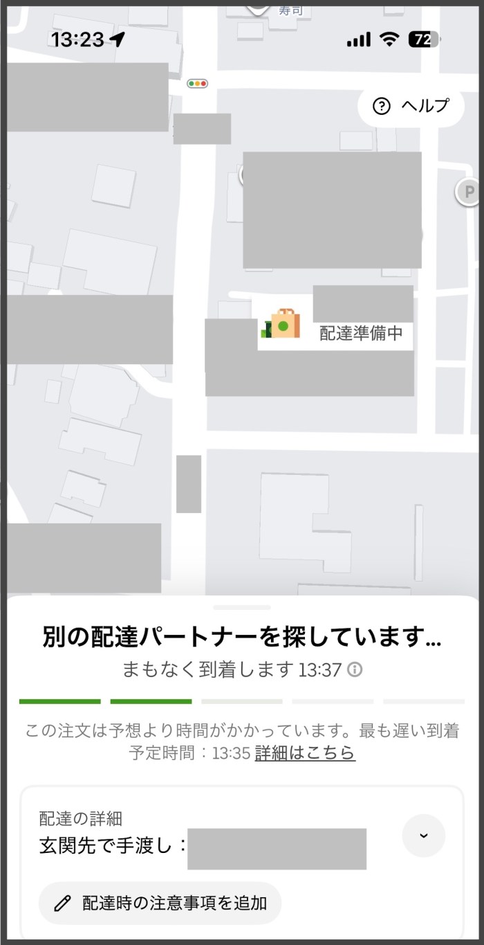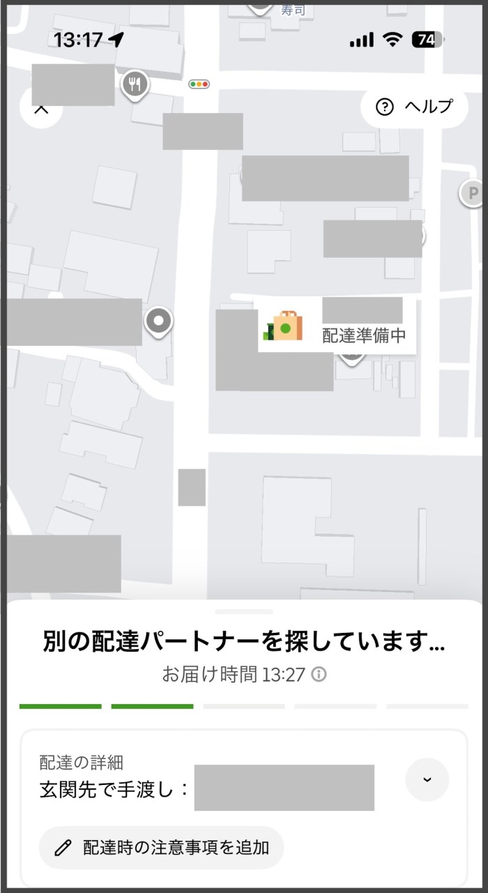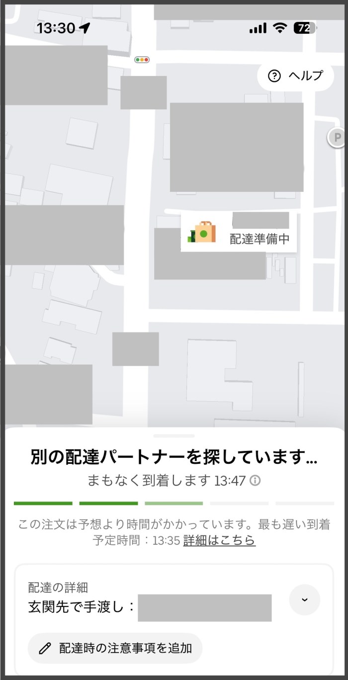 数分後……「まもなく到着します 13時47分」「別の配達パートナーを探しています」ときた。もう完全に1時間コース突入である。てか正直、北関東にそんな人材いねえよ。マジで見たことねーから。