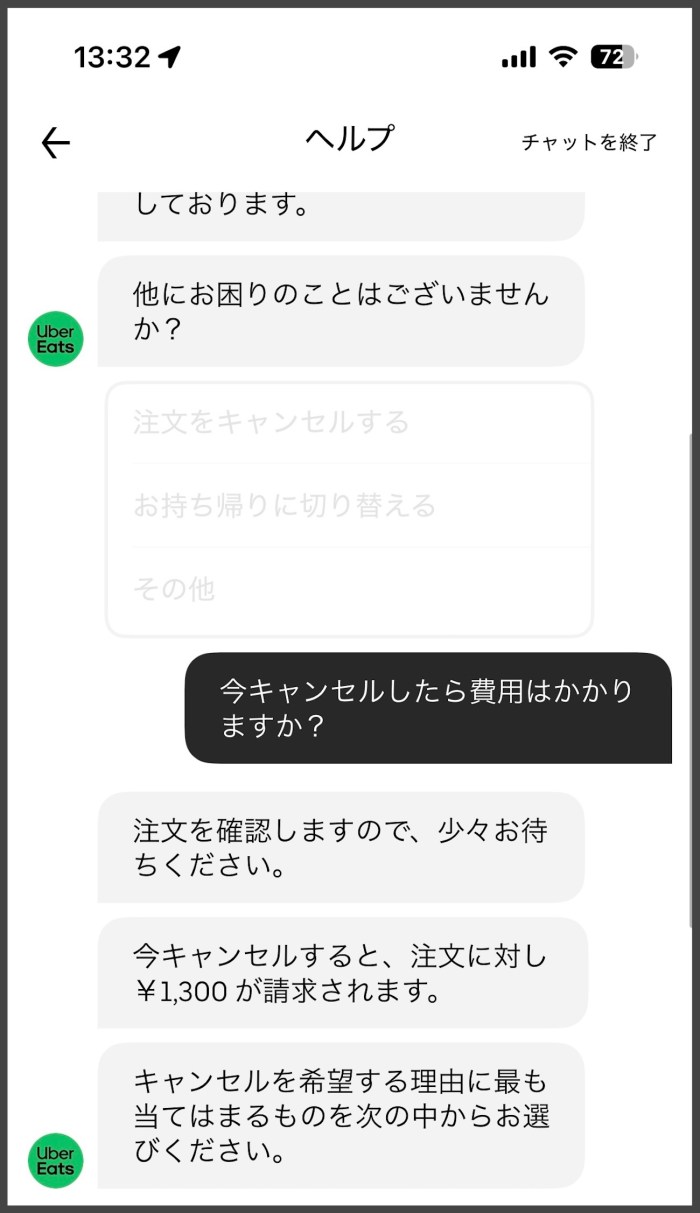 「今キャンセルすると、注文に対して1300円が請求されます」