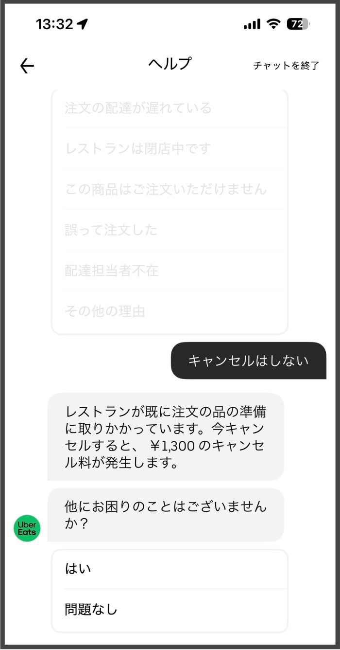 いや待て待て待て! ダメダメダメ! キャンセルしちゃ絶対ダメ! 急いでチャットを開き、ふたたび「注文が遅れています」を選んで送信……
