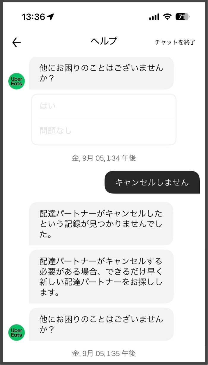 「配達パートナーがキャンセルしたという記録が見つかりませんでした」