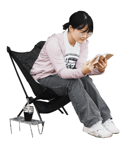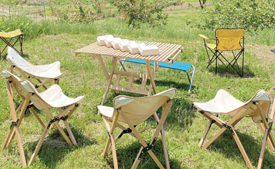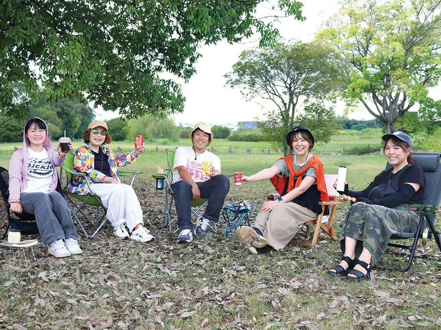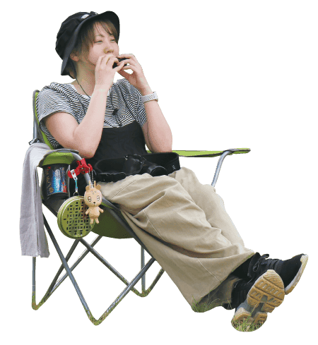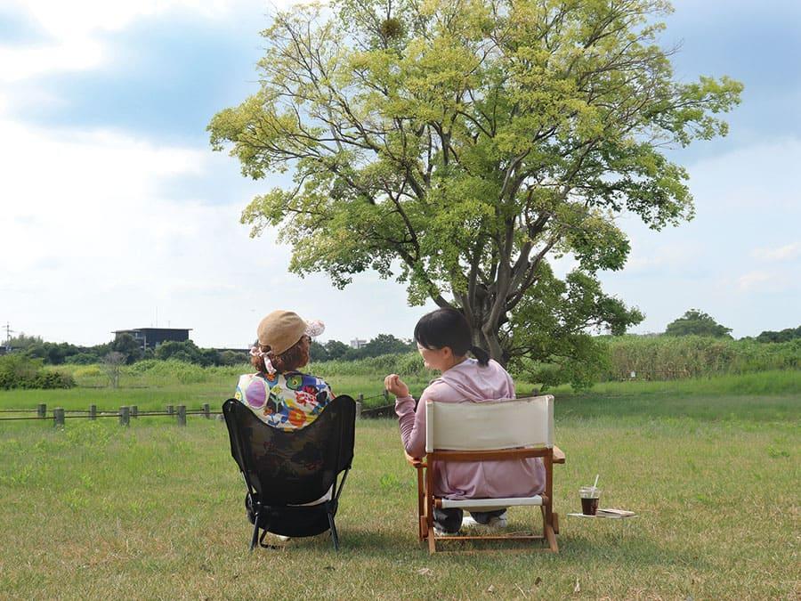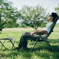 持ち運びしやすい軽量なアウトドア用の折りたたみ椅子を屋外に持ち出し、公園など好きな場所に置いて座って自由に時間を過ごすアウトドア体験。
