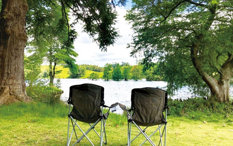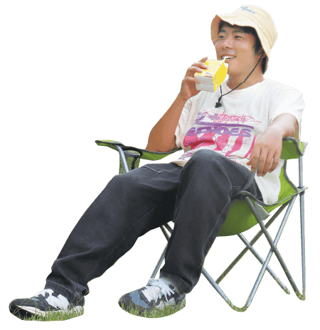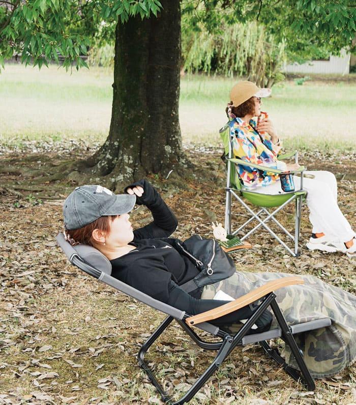 チェアリングは自分に合った椅子選びから。アウトドア専門店以外にも、ホームセンターなどでも豊富にそろう。リクライニングする椅子もある。
